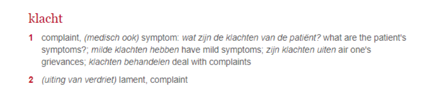 Quando se leem textos especializados, mesmo as palavras mais simples podem ser difíceis de traduzir. O texto seguinte, um excerto sobre endocardite (uma doença cardíaca), ilustra bem esta situação. No texto em neerlandês, a palavra “klachten” normalmente traduz-se por “complaint” em inglês. No entanto, num contexto clínico, esta não é a tradução que procuramos. Precisamos da palavra “sintoma”. Mas o motor de TA optou por “queixa” em todos os casos.